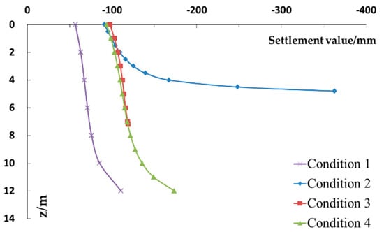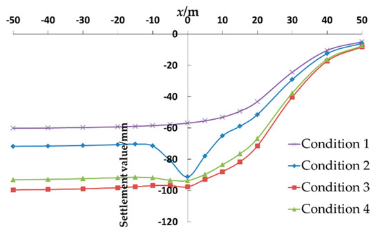 4.4. Distribution Law of Vertical Displacement of Soil along x-Axis and z-Axis