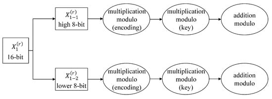 We use the composite affine mapping to encode , where . is also stored in the system. In particular, the addition modulo operation will be done with rather than a sub-key. We split into two parts and use to encode and . is the multiplicative inverse of from and is used to offset on . handles it, yielding . This leads to the following calculations: