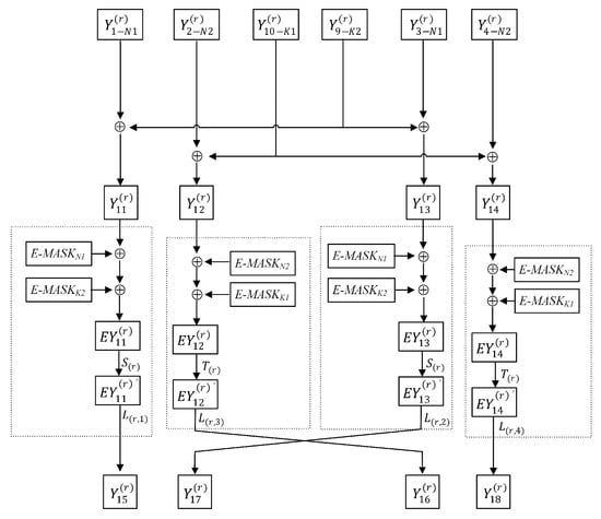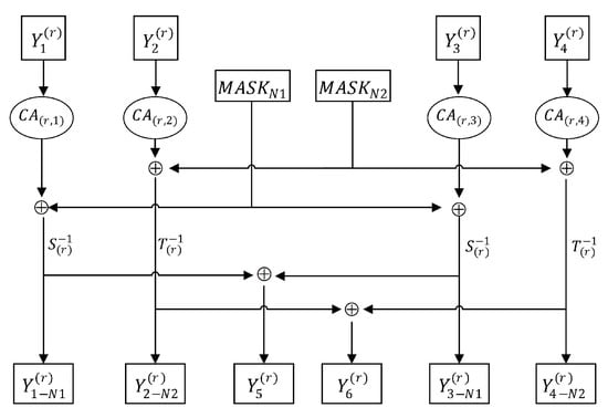 There are two different masks for each of the four results , , , and . We remove the masks with the XOR operations and then exchange and (see Figure 8).