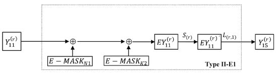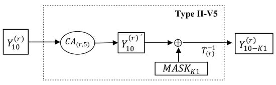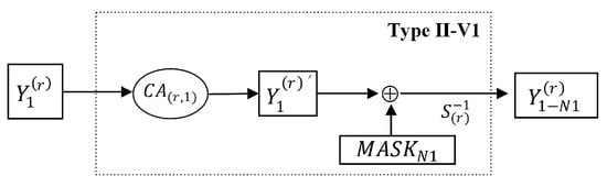 Here, we regard as a random group member from , as a 16-bit column, and the box as a type of S-box representing the multiplication modulo and the operation of the box. We regard the added masks as a box. This leads to