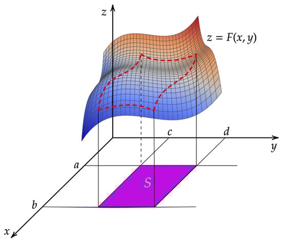 In general, the graph of a bivariate function F is a surface having the equation as we can see in Figure 3. Therefore, the definite integral of a positive function with two variables is a double integral, which represents the volume of the solid between the surface of the function and the plane that contains its domain (see Figure 3).