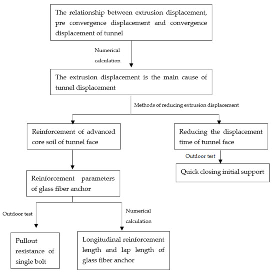 Professor Pietro Lunardi [,,] proposed that the strength and displacement characteristics of advanced core soil were the real inducers of tunnel displacement, and recommended the analysis of controlled displacement in rocks and soils method (ADECO-RS), which has been successfully applied to the full-face construction of many railway tunnels but has rarely been applied in the construction of urban shallow metro tunnels. Horn [] reported that the tunnel face would form a sliding surface at a specific position after failure. Assuming the shape of sliding surface and yield condition of soil, the support force of tunnel face failure can be deduced by static and torque balance calculations. This author assumed that the soil in the front of the tunnel face would be composed of prism and wedge. Based on the wedge model, Jancsecz and Steiner [] obtained the minimum ultimate support force expressed by the three-dimensional soil pressure coefficient Ka3d considering the influence of the tunnel soil arch effect. Based on the geostress theory of Terzaghi, Li [] obtained the ultimate support pressure of a shallow tunnel face in a clay soil layer by using a nonlinear minimum optimization algorithm. Based on the limit analysis method and strength reduction method, Chen et al. [] derived the functional formula for solving the stability coefficient of tunnel. An et al. [] used the limit analysis method to derive the stability coefficient of the tunnel face, and determined the influencing law of excavation footage with regard to the stability of the tunnel face. Based on the strength reduction theory, Du et al. [] reported on the displacement mutation or plastic strain energy as the basis for judging the stability of the tunnel face. Based on the limit equilibrium theory and horizontal slice method, Wang et al. [] deduced the calculation method of the limit support force of the tunnel face. Based on the research of the above scholars, we chose subway tunnels in a soft soil layer as the research object, and used the methods of theoretical analysis, numerical calculations, and orthogonal experiments to analyze the law characteristics of pre-convergence displacement, extrusion displacement, and convergence displacement of the tunnel after the core soil is excavated, while also considering the reinforcement measures of the tunnel face. The research approach of this paper is shown in Figure 1.