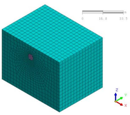 The stratum structure model was used to analyze the displacement mechanism of the surrounding rock during the full-face construction of a metro tunnel in a silty clay layer. The section size of a horseshoe-shaped subway tunnel is shown in Figure 2, with a width of 6.48 m and a height of 6.62 m. The initial support thickness was 25 cm, and the concrete grade was C20. Considering the disturbance effect of tunnel excavation with regard to surrounding rock, the calculation model used a value of 5 times the tunnel equivalent diameter, where the size was L * w * H = 60 * 80 * 60 m and the tunnel burial depth was 10 m. The calculation model is shown in Figure 3. In accordance with [], the physical and mechanical parameters of silty clay are shown in Table 2, and the calculation parameters of the initial support are shown in Table 3.
