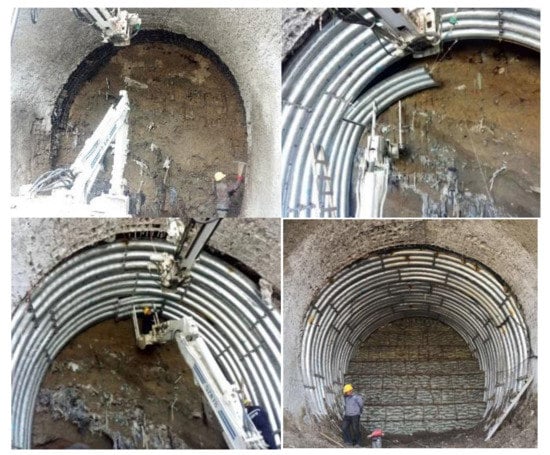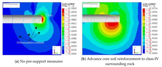 - There are two ways to control the displacement of the advanced core soil: One is to employ pre-reinforcement measures (use of full section grouting, glass fiber anchors) to improve the physical and mechanical parameters. The second is to shorten the displacement time of the advanced core soil. Closing the initial support in time will reduce the exposure time of the tunnel face.
