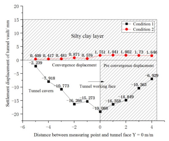 It can be seen from Figure 6 that when there are no pre-support measures, the displacement of the tunnel vault presents a concave curve, and the maximum settlement value is at the tunnel face, which gradually converges to the tunnel chamber and the unearthed soil. When the advanced core soil is reinforced by grade-IV surrounding rock, the settlement curve is an approximately straight line, and there is only a slight settlement trend at the tunnel face. The pre-convergence displacement and convergence displacement can be ignored, and because the strength of the advanced core soil is too high, the tunnel vault appears to be uplifted.