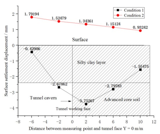 As can be seen from Figure 7, the surface displacement is similar to that of the tunnel vault. Without pre-support measures, the maximum settlement displacement occurs near the surface above the tunnel face. The results show that the convergence displacement and pre-convergence displacement were greatly reduced after the reinforcement of the advanced core soil, and surface uplift displacement occurred.