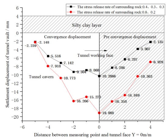 It can be seen from Figure 8 that the stress release rate of surrounding rock changed from 0.8 and 0.2 to 0.4, 0.3, and 0.3, the settlement displacement of tunnel face vault decreased by 85.6%, and the pre-convergence displacement decreased by 224.5%. Timely support can reduce the stress release rate of surrounding rock and the standing time of tunnel face soil, which are beneficial for reducing the settlement displacement and pre-convergence displacement of the tunnel face vault.