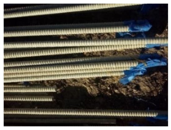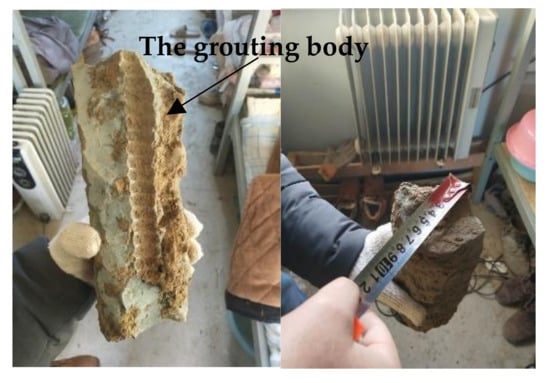 When the installation spacing was less than 1 m, the pull-out force of the glass fiber anchor appeared to couple with the amplification effect. The end grouting method was adopted for the glass fiber anchor rod. The diffusion radius of slurry in silty clay was 7 cm, as measured from the grouting body obtained after excavation (Figure 12).