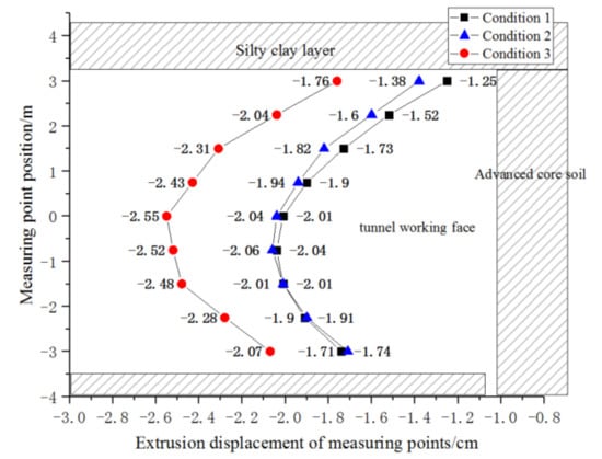 Extrusion displacement of the tunnel face under 3 conditions.