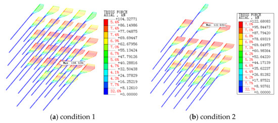 Two conditions are shown in Figure 14, which presents an axial force diagram of the remaining 2 m of the reinforcement length of the glass fiber anchor. The maximum axial force of the glass fiber anchor in condition 1 was 104.328 kN, located in the lower half of the section. In condition 2, the maximum axial force of the glass fiber anchor was 122.681, kN, located in the upper half of the section. This was due to the increase in reinforcement density, which led to the relative increase in the axial force of the single glass fiber anchor. According to the axial force, the specification of the glass fiber anchor can be chosen or new reinforcement materials with tensile strength but no shear strength can be developed.