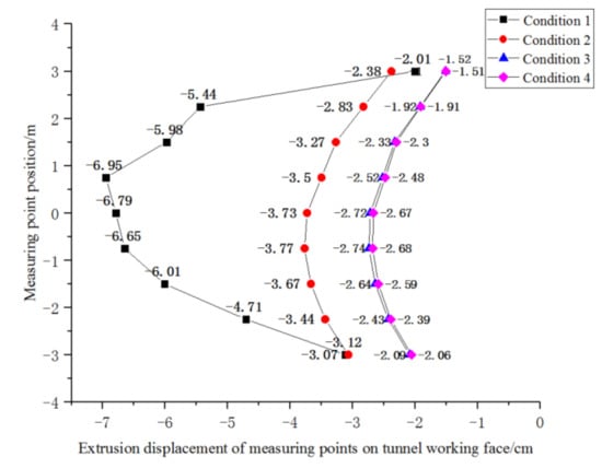 Compared with no pre-support measures (Figure 5), the maximum extrusion displacement of tunnel face in condition 1 was reduced by 6/7. It can be seen that the glass fiber anchor with a reinforcement density of 1.0 × 1.0 m played a great role in controlling the extrusion displacement of the tunnel face. Comparing the displacement curves of condition 2 and condition 1, it can be seen that changing the reinforcement density of the upper half section had no obvious effect on the extrusion displacement of the tunnel face. Compared with condition 1, the installation density of glass fiber anchor rod in condition 3 increased from 1.0 × 1.0 m to 1.5 × 1.5 m, and the extrusion displacement of the tunnel face obviously increased, with the maximum value of 2.55 cm (increase of 25%). From the comparison of the three curves, it can be concluded that the extrusion displacement of the tunnel face mainly occurred in the middle and lower sections (about 1/3 of the distance from the vault). Strengthening the middle and lower sections can effectively restrict the extrusion displacement. It is reasonable to choose an upper sparse and lower dense reinforcement method, which may not only reduce the material cost but also shorten the reinforcement time of the tunnel face.