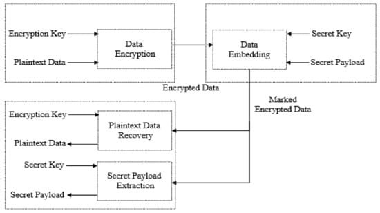 In the literature, some RDHEI techniques have been introduced [,,,,] which allow retrieval of auxiliary information only after decryption of marked encrypted data. In other words, auxiliary information can be extracted using a secret key only after performing the decryption using the encryption key . TheseRDHEI techniques are known as non-separable techniques. In [,,,,,,,,,,,,,,,,], another variant of RDHEI techniques, i.e., separable RDHEI techniques, was introduced to overcome the limitation of non-separability. These techniques allow separate restoration of subscriber data and extraction of auxiliary information from the marked encrypted information. In other words, an encryption key keeper can perform the decryption process separately without being restricted by the auxiliary information extracting process, and similarly a secret key keeper can perform the auxiliary information extracting process without being restricted by the decryption process.