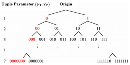 This Parametric binary tree labelling (PBTL) scheme is first postulated by Yi et al. in 2018 for labelling the pixels of the plaintext image so that the auxiliary information can be efficiently embedded. The plaintext image pixels are represented by 8-bit depth; hence, the seven layers are generated in the parametric binary tree as shown in Figure 2. In the PBTL, each layer has nodes and each node is represented by binary bits where is the layer number. The details regarding the total number of nodes in each layer of the seven-layered PTBL is provided in Table 1.