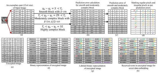 Figure 4 shows an illustrative example of proposed RDHEI technique. The tuple parameter is taken as = and block size is taken as 4 × 4. Figure 4a shows a part of the baboon image of size 12 × 4. The input image is partitioned into non-overlapping blocks of size 4 × 4. Now, the blocks are categorized into smooth blocks, moderately complex blocks, and highly complex blocks using their corresponding quantization levels and mean values calculated by Equations (3)–(5), considering first threshold parameter = 16 and second threshold parameter = 32. The absolute difference between quantization levels of the first block is 3, so it is a smooth block. The absolute difference between quantization levels of the second block is 29, so it is a moderately complex block. The absolute difference between quantization levels of the third block is 32, so it is a highly complex block. Highly complex blocks do not participate in secret payload embedding because pixels in the block are uncorrelated or correlated very little. Thus, only smooth blocks and moderately complex blocks are utilized for data embedding. The mean value of the first block is computed as 190 and the mean value of second block is computed as 103 using Equation (3). In Figure 4b,c, prediction errors are shown for each pixel of the block except for highly complex block. Based on the prediction errors, pixels of special set , base set , regular set and irregular set are determined as shown in Figure 4d. Now, input image is encrypted using stream encryption with encryption key as shown in Figure 4e. Figure 4f shows an 8-bit binary representation of encrypted image. Using the tuple parameter (2,3), labelling bits for each pixel are determined PBTL structure. Pixels of the encrypted image corresponding to regular set and irregular set are labeled based on predictor errors. Figure 4h shows number of vacancies created in labeled regular pixels for embedding secret payload.