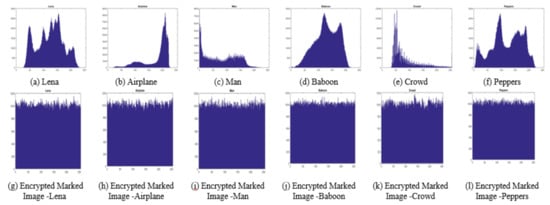 In this subsection, encryption performance of the proposed technique is examined by computing pixel distributions of the marked encrypted images. Ideally, it should be uniform for the encrypted data as the encryption process completely destroys correlations present in original data to provide robustness. The proposed technique also provides uniform pixel distribution which is evident from Figure 6a–f, showing histograms of all test images, and Figure 6g–l, showing histograms of marked encrypted images for all the test images. The X-axis and Y-axis of the histograms represents number of pixels and intensity range (0–255), respectively.