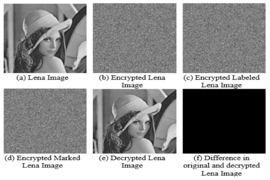 In Figure 7c, an encrypted labeled Lena image is shown and Figure 7d shows a marked encrypted Lena image which includes a secret payload containing the encrypted auxiliary information, encrypted using secret key . In Figure 7e, a decrypted Lena image is shown, which is similar to the original Lena image. In Figure 7f, the difference between Figure 7a,e is seen, showing a black image as all the pixel values are zero. Thus, Figure 7e depicts that the original image is fully recovered as it has PSNR → +∞ and SSIM = 1 with respect to the original image.