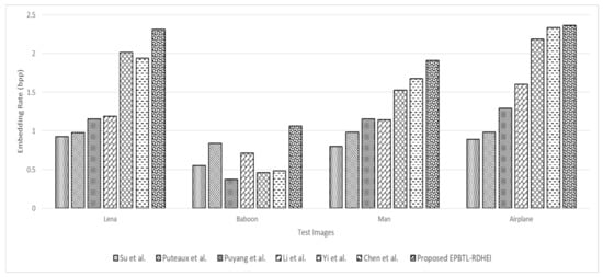 For optimal embedding performance, = 4 & = 4 and a block size of 4 × 4 pixels is considered for the proposed RDHEI technique. The embedding performance is compared with some of the high-capacity state-of-the-art techniques that provide highest embedding rate. Since Yi et al.’s [] and Chen et al. [] have optimal performance at = 2 & = 5 with block size of 3 × 3 pixels and block size of 4 × 4 pixels, respectively.