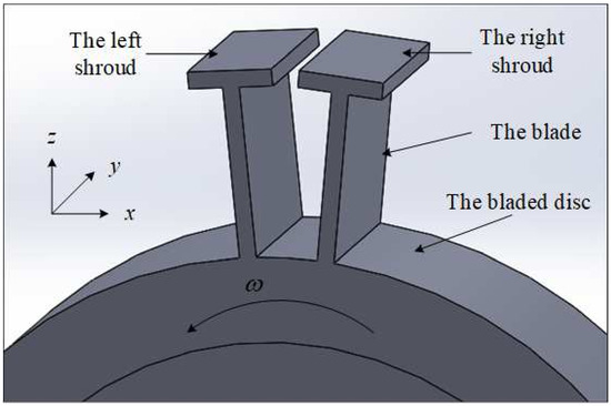 In engineering, shrouded blades are set up in a circle around the disc, and the whole structure can be considered to have a cyclic symmetry. In this paper, the structure model including two shrouded blades is discussed, as shown in Figure 1, where the orthogonal coordinate system attached to the disc is defined by three orthogonal directions, namely the tangential direction (), axial direction (), and radial direction ().