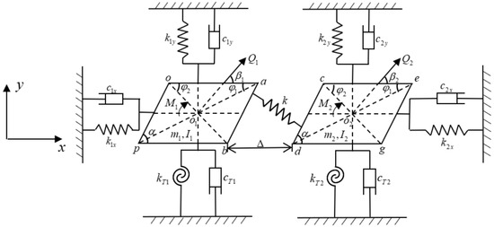 In order to analyze the complex collision motion between adjacent shrouds, adjacent shrouded blades are simplified as two homogeneous mass blocks which are two parallelograms with the same size and shape, and the dynamic model of the shrouded blade system, which is a three-degree-of-freedom mass-spring model, is established based on [26] and shown in Figure 2.