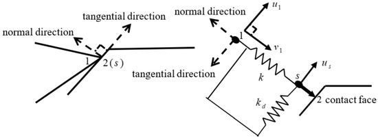 As shown in Figure 6, when point happens to be in contact with the left mass block, the difference between projections of displacements of points and along the direction perpendicular to is equal to the projection of the initial gap along this direction. The second contact-separation transition boundary condition is described as Equation (11):
