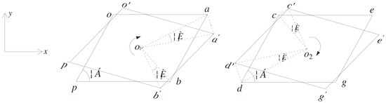 Based on the analysis above, the total displacement vectors of points , , , and , denoted as , , , and , are composed of the translational displacements and the torsional displacements. The computing formulas can be expressed as