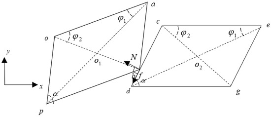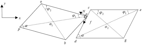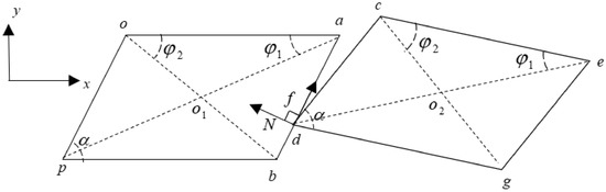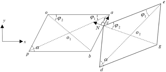 In Figure 2, when the two mass blocks are in contact, the normal load caused by impact is simulated by a linear spring, while the friction force is modelled by the bilinear hysteresis model with normal load varying. It should be pointed out that and are forces exerted by the right mass on the left mass, and their action points which are determined by the kinematics analysis in the following section keep changing. The moments of and about points and can be calculated when the magnitude, direction, and acting point of the contact forces are determined. Meanwhile, the geometric dimensions of the mass blocks are identified in Figure 2: one of the vertex angles of the parallelogram shroud is ; the lengths of the two line segments and are denoted as and , and are denoted similarly.