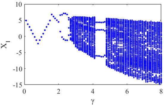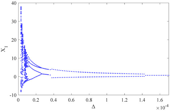 In Figure 15, it can be seen that the value of eventually stabilizes with the increase of the value of . Therefore, when the chaos occurs, we can select the stable value of for the vibration reduction analysis of the system.