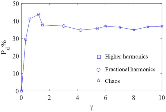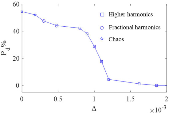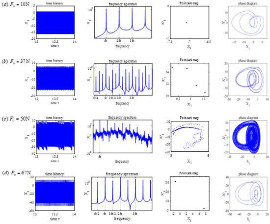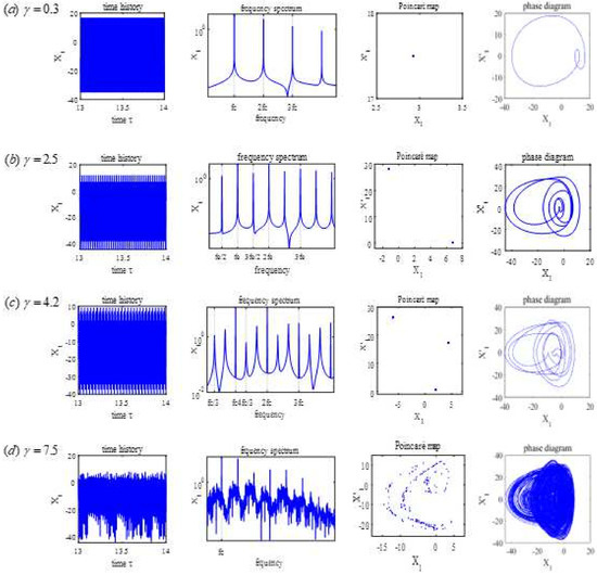 Figure 13 shows the bifurcation diagram of vs. , which is illustrated by Figure 14. Analysis of the Poincare map, the spectrum, and the phase diagram show the following conclusions. In Figure 14a, where , only higher harmonics exist, and period-1 motion occurs. In Figure 14b, where , fractional harmonic frequencies () exist, and period-4 motion occurs. In Figure 14c, where , the response is chaotic. In Figure 14d, where , fractional harmonics frequencies () exist, and period-2 motion occurs. In summary, with the increase of the value of , the responses follow a sequence of period-1, period-4, chaotic, and period-2 motion.
