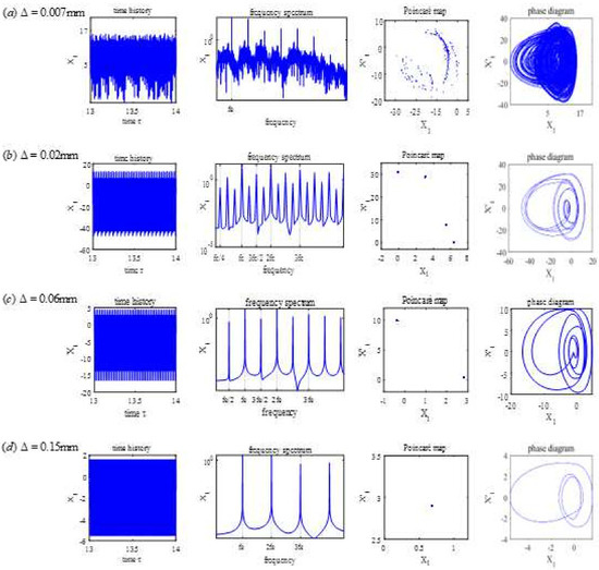 Figure 11 shows the bifurcation diagram of vs. , which is illustrated by Figure 12. Analysis of the Poincare map, the spectrum, and the phase diagram show the following conclusions. In Figure 12a, where , the motion of the blade is chaotic. In Figure 12b, where , there are fractional harmonic frequencies (), and the response is period-4 motion. In Figure 12c, where , there are fractional harmonic frequencies (), and period-2 motion occurs. In Figure 12d, where , the impact and dry friction forces become very small, and period-1 motion occurs. In summary, for the factor of , with the increase of its value, the responses follow a sequence of chaotic, period-4, period-2, and period-1 motion.