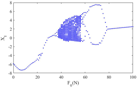 In Figure 17, with the increase of the value of from zero, the responses follow a sequence of chaotic motion, period motion with fractional harmonics, and period motion with higher harmonics, while the value of keeps decreasing as the amplitude of normal load and friction force decreases. When the value of is larger and larger, the two masses of the system are separated during the whole motion, and the value of is equal to zero. In the range of the selected values of , the steady system has no pure viscous motion.