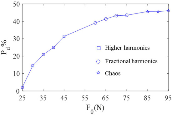In Figure 18, with the increase of the value of , the responses follow a sequence of period motion with higher harmonics, period motion with fractional harmonics, and chaotic motion, while the value of approximately increases to an approximate stable value. The law of variation of with is mainly due to the increase of the amplitude of normal load and friction force as increases. The reason for the stabilization of is that viscous motion plays a dominant role when the system is steady, as the normal load and friction force increase to a certain extent.