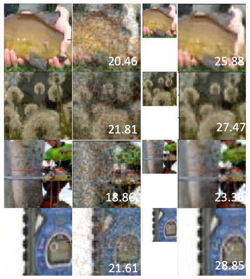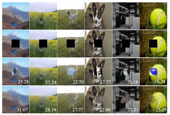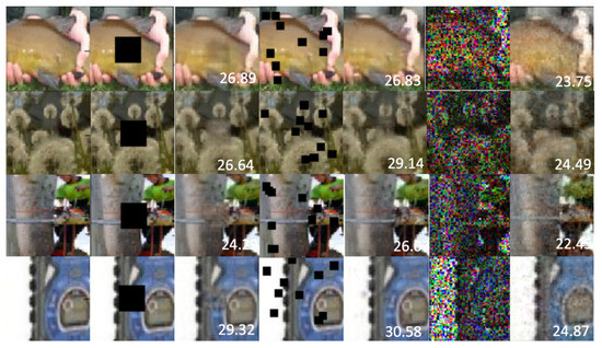 - Pathak, D.; Krahenbuhl, P.; Donahue, J.; Darrell, T.; Efros, A.A. Context encoders: Feature learning by inpainting. In Proceedings of the IEEE Conference on Computer Vision and Pattern Recognition, Las Vegas, NV, USA, 27–30 June 2016; pp. 2536–2544. [Google Scholar]