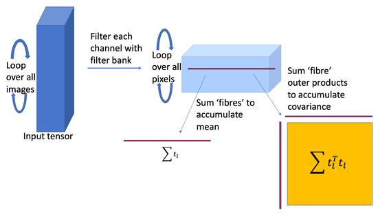 Illustration of the accumulation of the sum of ‘fibres’ and their outer products used to compute the mean and covariance matrix in a single pass through all images per output layer.
