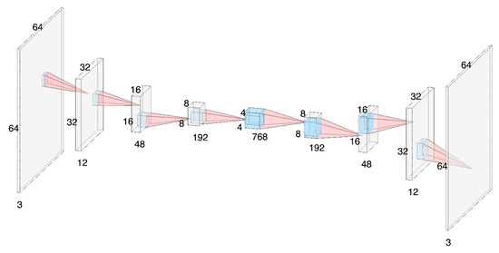 The network can incorporate non-linear elements, such as activation functions between networks, max pooling layers, batch normalisation etc. There is no dependency on learning (as there is for back propagation), but some of these elements make inversion difficult or impossible. For the work described here we focus on linear inverse problems, we need to be able to perform the inverse transform and so leave investigation of these aspects to future work. The structure used in this paper is shown in Figure 5. A simplified table of the layers is shown in Table 2. For the most part the algorithm can be implemented using standard layers (e.g., in Tensorflow Keras). The filters can be applied either separably or pre-calculated into three dimensional () filters for the construction. Symmetric padding is used to handle the borders. For the reconstruction, transpose convolution is used. Due to the use of some anti-symmetric 1D filters, we need to first apply the inverse PCA decomposition to reconstruct the set of original filtered channels. This allows us to use anti-symmetric border padding for the correct handling of the borders of the anti-symmetric filtered channels (performed using regular symmetric padding and multiplication by a mask of mostly 1’s and ’s for the anti-symmetric padding values) (Code available from https://github.com/bptiddeman/PCWN.git or as a Google Colab demo https://colab.research.google.com/drive/1bRji-34Icy8serMzxZ0r-S2FqVOfgw2-?usp=sharing) (accessed on: 17 February 2021).