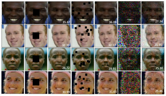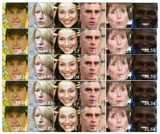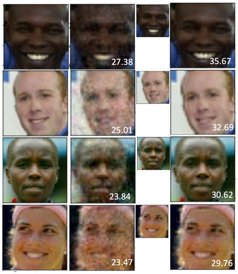 The quantitative results on face images are presented in Table 3 and examples are shown in Figure 7 and Figure 8. We follow previous authors and use the Peak Signal-to-Noise Ratio (PSNR) to assess our results. PSNR is defined as: