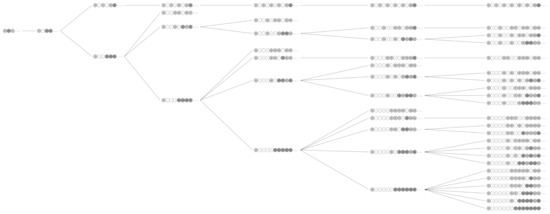 The tree up to depth 7. White dots refer to the gaps, dark gray dots to the generators and the light gray ones to the elements of the semigroups that are not generators.