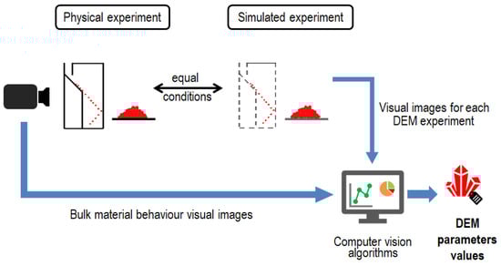The developed approach scheme is shown in Figure 2. For the investigated bulk material Young’s modulus, Poisson’s ratio, and particle size distribution are determined using well-known techniques [31,32,33,34,35]. A certain amount of material (portion) is poured into the developed test rig, and then its rheological properties are studied. The flow of the portion is recorded with a pre-installed high-speed camera. After that, the recording from the camera is sent to the computing device. A video processing algorithm developed using machine vision is used; values and parameters characterizing the rheology of the material are recorded. For DF coefficients, these parameters are flow times along the inclined shelves (Equation (1)); for CoR, these are angles and velocities of rupture and reflection (Equation (2)) [36]. Then, the experiments are repeated in the DEM software within the same conditions, but a series of numerical experiments are carried out, where the DEM parameters vary in a given range. For each experiment, an animation is recorded and then processed using similar machine vision algorithms. The experiments in the simulation are symmetrical to the full-scale experiments. A functional relationship is built between the parameters obtained from the simulations and DEM parameters. The obtained function depends on the particle size distribution and particle shape of the material, as well as on the applied contact model and its specific implementation in the DEM software. This means that the input data must be determined in advance. As a result, the obtained dependence is substituted with the values from a full-scale experiment, which makes it possible to obtain specific values of DEM parameters. In this case, the obtained values require clarification; therefore, the repose angle and the flow time are additionally measured. Then, in DEM software, DEM parameters are iteratively varied in a narrow range, which results in fairly accurate results of DEM parameters values.