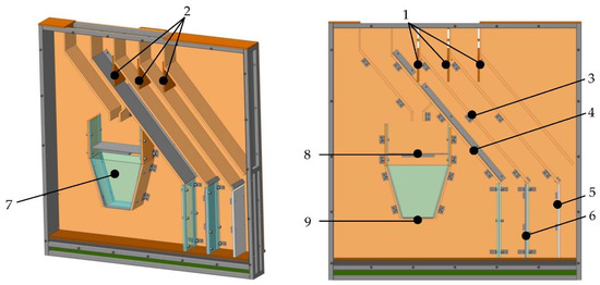 Design of the test rig (model). 1,2—vertical partitions, 3—shelf for DFPP, 4—shelf for DFPB, 5, 6—collision walls, 7—discharge hopper, 8—upper partition (for angle of rupture), 9—lower partition (for angle of repose).