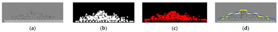 Image processing algorithm example for angle of repose; (a)–original image; (b)–binarized image; (c)–morphological processing applied; (d)–final result.