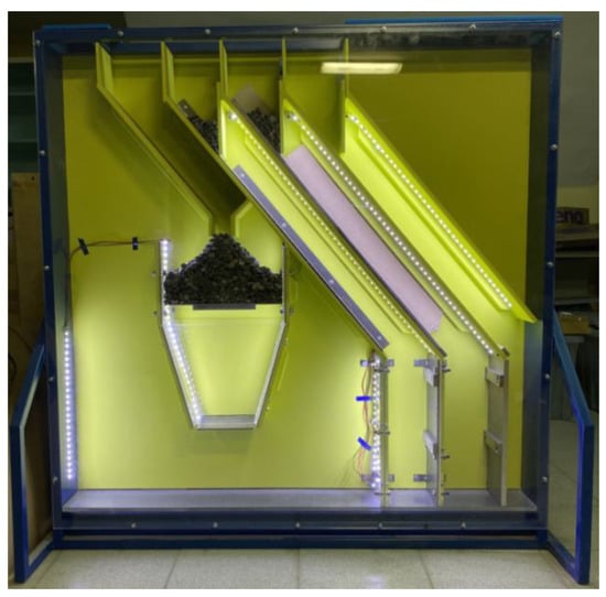 The test rig at the current stage of research is shown in Figure 3. The test rig has the shape of a rectangular parallelepiped measuring 1 × 1.5 × 0.13 m with inclined shelves located inside, vertical partitions 1–2, bins for loading bulk material, and a funnel-shaped device for testing the angle of rupture and repose, as well as a system of dampers for controlling the flow of materials.