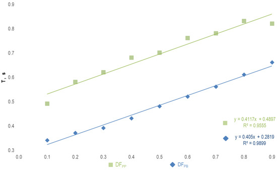 Next, a series of simulations were carried out in Rocky DEM. The DFPB and DFPP coefficients varied from 0.1 to 0.9 with a step of 0.1. The flow time was recorded for each experiment. According to the data, functional dependence was built (Figure 9).