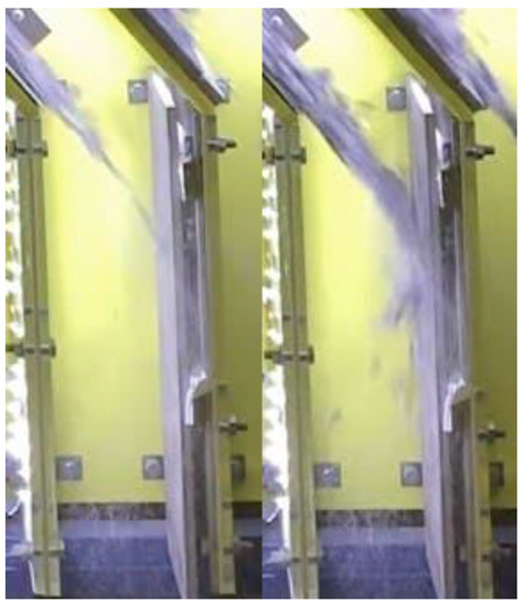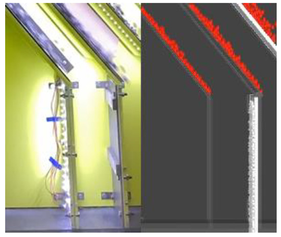 After the DF coefficients have been obtained for all pairs, it is possible to proceed with the CoR coefficient determination. For this, the shelves (steel) are mounted vertically. The angles of rupture and reflection, as well as the velocities before and after the collision of particles with the shelves, were determined by software algorithms of the computer vision system and recalculated into the values of the CoRPP and CoRPB coefficients according to Equation (4). Simultaneously, numerical experiments were carried out with varying CoR coefficients in the range from 0.1 to 0.9. Similarly, the values obtained by Equation (4) made it possible to refine the values of the coefficients obtained in full-scale experiments (coefficient k in formula 4). Figure 11 shows an example of a collision in a full-scale experiment.