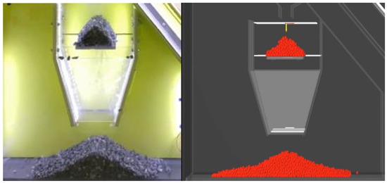 From the obtained dependences, the DF coefficients were evaluated, presented in Table 4. Figure 10 shows an example of a visual comparison of a full-scale experiment with an ore–steel 1 pair and simulation with a DFPB value of 0.3. Visually, it is noticeable that the flow time is almost identical. Moreover, according to the obtained dependence, the value of the coefficient for this pair is 0.29.