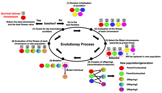 The GA is undoubtedly the most widespread and typical example of EAs. It was first proposed by John Holland in 1975. The GA adopts Darwin’s theory of natural selection and evolution. Since then, it has been widely applied in different disciplines. The GA is typically designed by identifying a set of candidate solutions called chromosomes. The set of these chromosomes builds a population. Each chromosome is divided into smaller units called genes. The length of the chromosome (the number of genes) determines the dimensionality of a problem. At each iteration of the GA, a set of evolutionary operators (selection, crossover, mutation) is applied to create diversity in the current population in order to prepare a new population in a way that simulates the natural evolution. Each chromosome is evaluated according to certain evaluation criteria (object functions) to determine its quality and decide if it is fit or unfit. The highest evaluated solution (best individual) is preserved in each iteration. The unfit solutions (worst individuals) are candidates to be replaced by the newly generated offspring. This allows the average fitness value to increase dramatically throughout the iterations. Figure 1 shows the GA’s evolutionary process.
