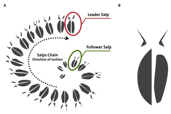 SSA is one of the widely used SI algorithms that was inspired by a kind of animal that lives in the seas and oceans, called salps. Their behavior that is modeled is reaching a food source. The leader of the salps is the first salp in the chain. It leads the remaining salps in the chain towards the food source. The remaining salps in the chain follow the leader salp. Salps implement a dynamic movement with respect to each other. Therefore, there is a direct or indirect change in the positions of follower salps towards the leader salp. The original SSA algorithm was continuous. Therefore, the same steps followed for converting the PSO to binary were used with the SSA to convert it to binary. Figure 2 shows a single salp and the salps chain.