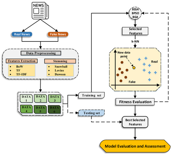The aforementioned studies above did not introduce an evolutionary classification technique to show the most essential features of the COVID-19 fake news information. As a result, this study proposed an evolutionary-based detection approach to capture the most important features of fake news information. Our approach aimed to reduce the number of features and achieved a high accuracy. Four evolutionary classifications techniques (k-NN-BSSA, k-NN-BPSO, k-NN-BGA, and k-NN) were used. Furthermore, three wrapper feature selection techniques (BGA, BPSO, and BSSA) were implemented to evaluate the output features.