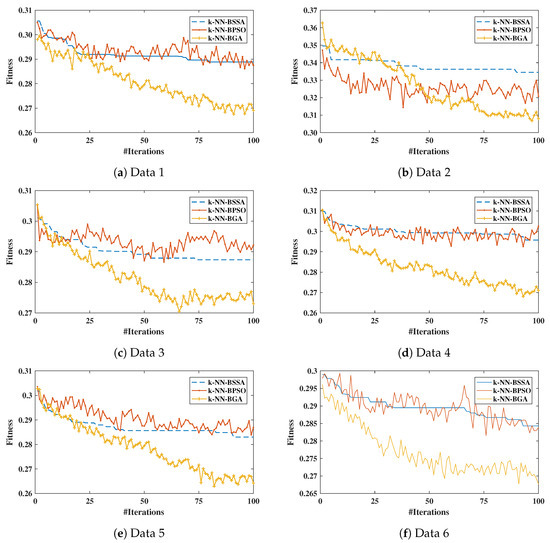 The convergence curves of all algorithms and datasets can be found in Figure 4. The figure confirms the better performance of k-NN-BGA against the other algorithms. It is worth mentioning that the convergence curves were calculated according to Equation (7).