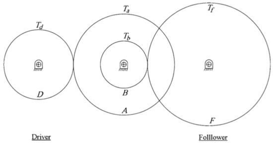 Gear design problem is also a popular engineering optimization problem. Figure 6 shows the gear train design problem model [43]. When designing compound gears, the gear ratio between the drive shaft and the driven shaft should be considered. The gear ratio is defined as the ratio of the angular velocity of the output shaft to the angular velocity of the input shaft. Our goal is to make the gear ratio as close as possible to 1/6.931. For each gear, the number of gears is between 12 and 60. The variables Ta, Tb, Td and Tf are the number of teeth of gears A, B, D, and F, and the number of teeth must be an integer.