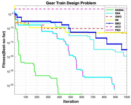 Table 10 shows the experimental results of the gear train design problem. As can be seen from the table, both SASSA and PSO can get 1/6.931, but the mean value and variance of SASSA are the smallest, indicating that its overall performance and stability are better. Figure 7 is the convergence curve. It can be seen that compared with other algorithms, SASSA has significant advantages in terms of convergence accuracy and speed.
