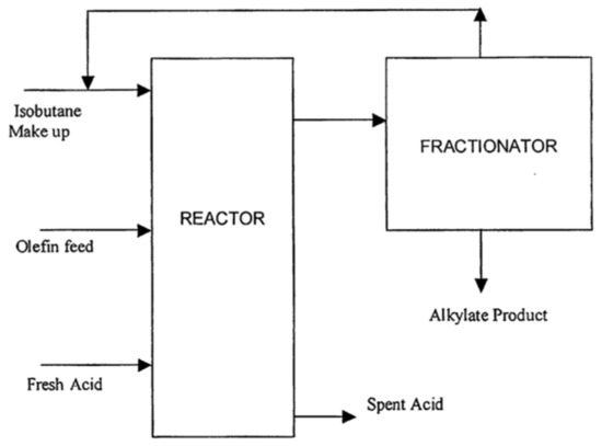 The optimal operation of alkylation unit is a very common in the petroleum industry. Figure 8 shows a simplified alkylation process flow [44]. As shown in the figure, the olefin feedstock (100% butane), pure isobutane recycle and 100% isobutene supplement are introduced into the reactor together with the acid catalyst, and then the reactor product is passed through a fractionator, where isobutene and alkane are separated. The base product, spent acid is also removed from the reactor.